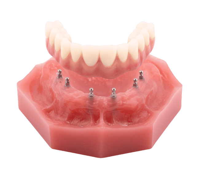 For patients who want a more permanent solution that doesn’t need to be removed daily, two popular options are Fix-on-Six® and All-on-4®.